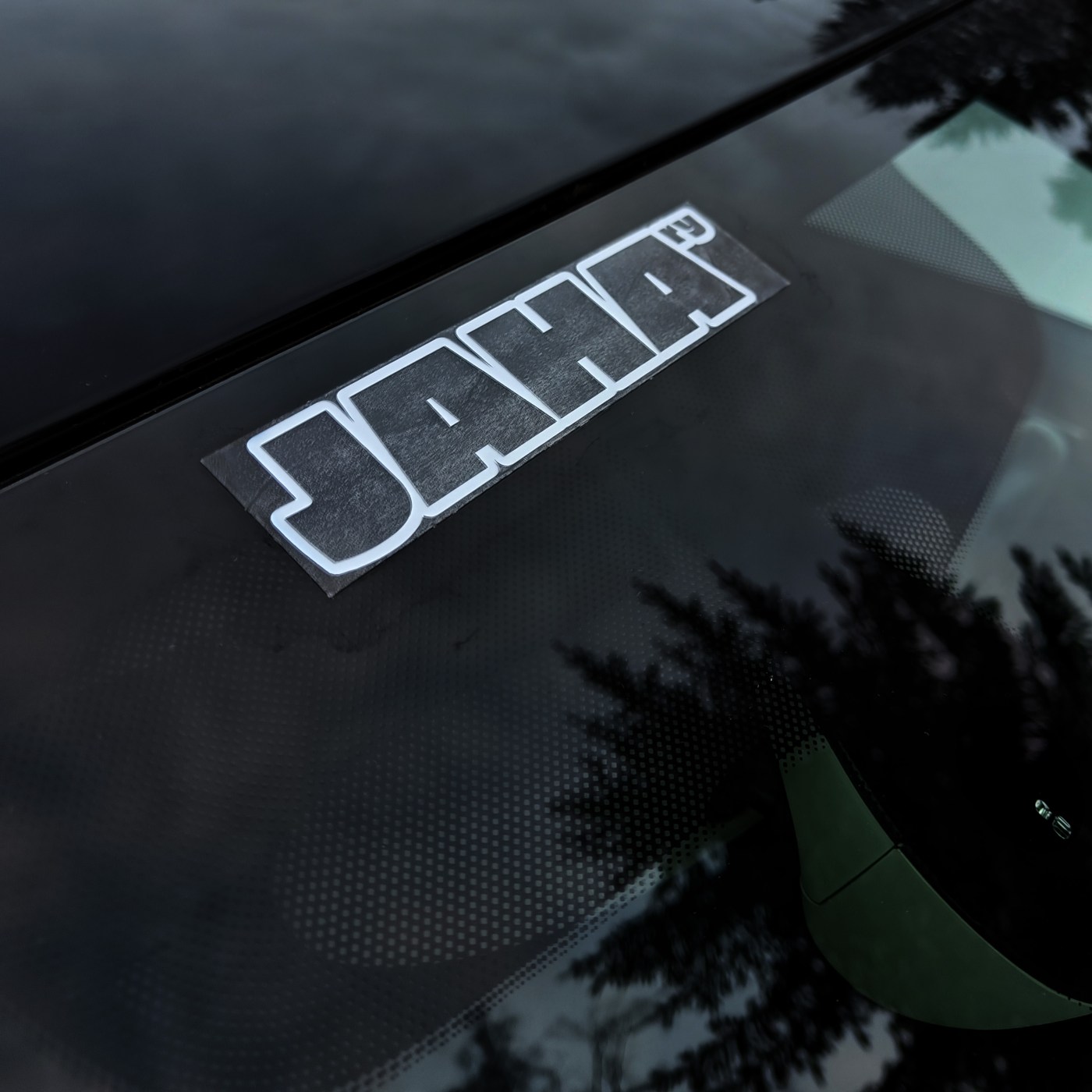 Ensimmäinen lisätty tuote on läpinäkyvä vinyylitarra, jossa JAHA ry logo valkoisella. Kylmällä kelillä liimattuna ei nyt oikein tuntunut ilma karkaavan tuolta lasin ja tarran välistä, mutta siisti ja kiiltävällä pinnalla oleva tarra on helppo liimata ja näyttää hyvältä.